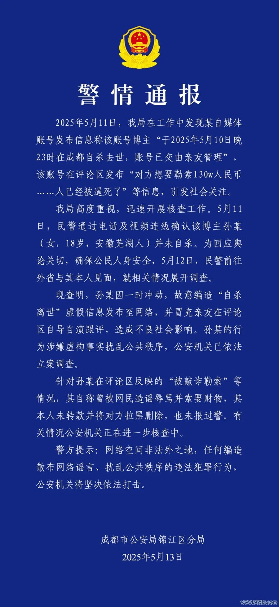 随着5月13日凌晨成都市公安局锦江区分局发布警情通报,百万粉丝网红“是小念噢”自编自导“自杀离世”的闹剧暂告段落。