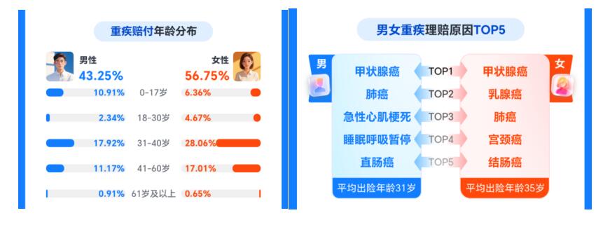 在重疾险赔付中,31-40岁人群占比近46%,正值家庭“顶梁柱”的黄金期,面临家庭、事业、健康的三重压力。从出险原因来看,甲状腺癌是男女重疾理赔的首要原因,肺癌成为跨性别第二大威胁,且男女平均出险年龄分别为35岁和31岁,重疾年轻化趋势显著,凸显了重疾保障的重要性。