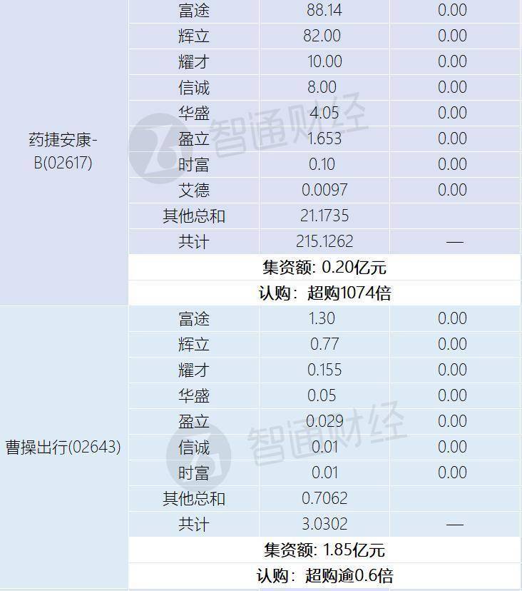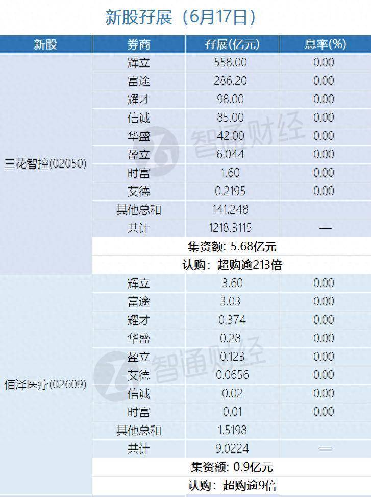 智通财经APP获悉,三花智控(02050)、佰泽医疗(02609)、药捷安康-B(02617)、曹操出行(02643)、香江电器(02619)正在招股中。截止6月17日中国十大配资公司,富途、辉立、耀才等券商合计为三花智控借出1218.3115亿港元,超购逾213倍;合计为佰泽医疗借出9.0224亿港元中国十大配资公司,超购逾9倍;合计为药捷安康-B借出215.1262亿港元,超购逾1074倍;合计为曹操出行借出3.0302亿港元,超购逾0.6倍;合计为香江电器借出0.6079亿港元,超购逾1.6倍。